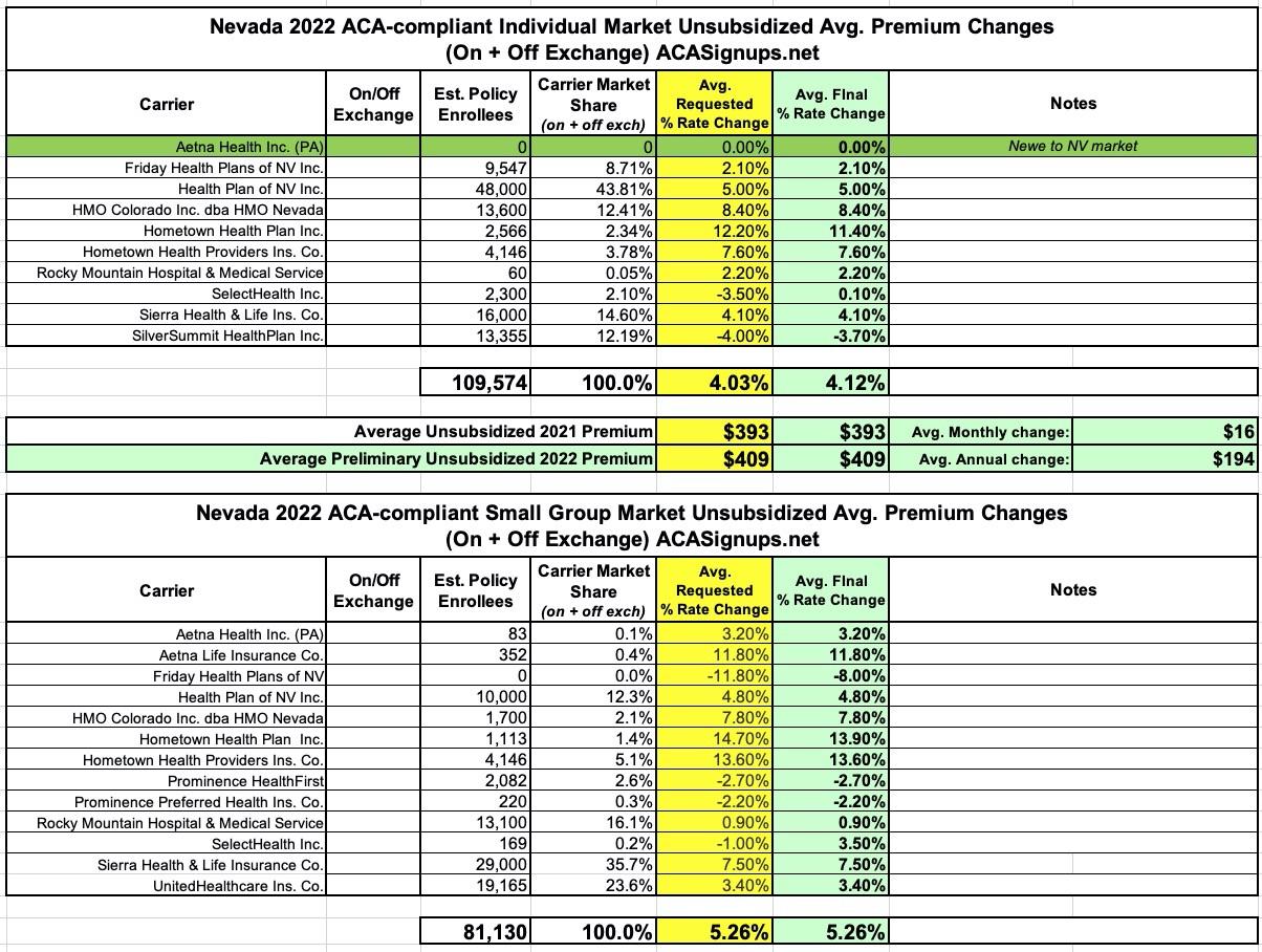 Also, while Aetna is definitely new ot the Nevada market, the note abouot Hometown Health Plan is a bit confusing: It looks like they were available off-exchange last year, but they're newly available on-exchange in 2022 as well (they had around 2,600 enrollees this past spring).