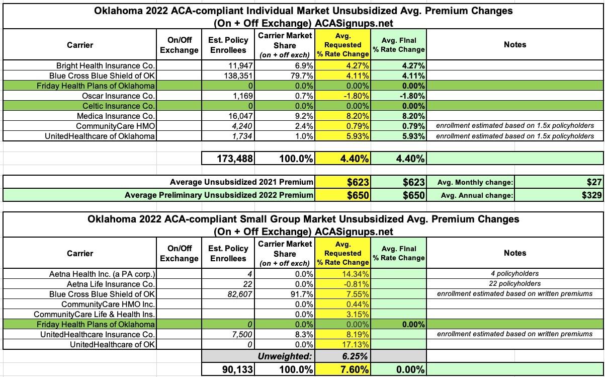 Oklahoma: Approved avg. 2022 #ACA rate changes: +4.4% indy market (weighted); +6.3% sm. group (unweighted)