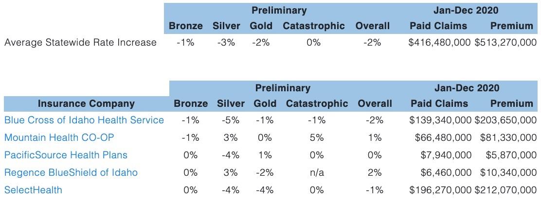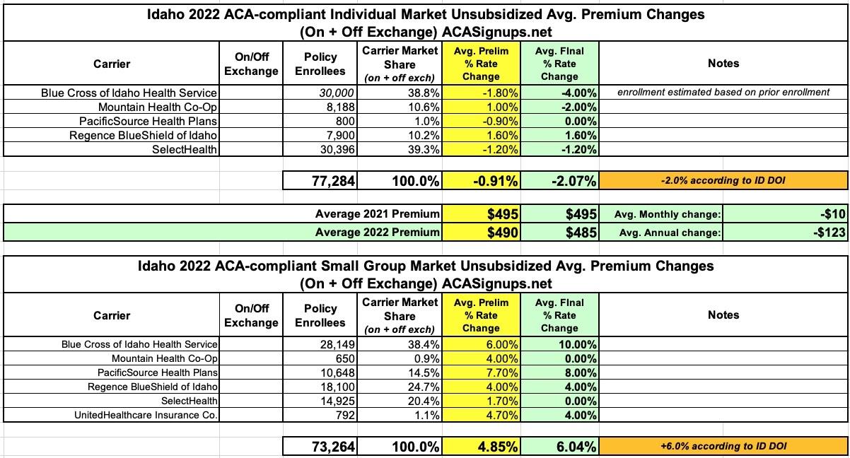 Idaho: Approved avg. 2022 #ACA rate changes: -2.0% indy market; +6.0% sm. group market (updated)