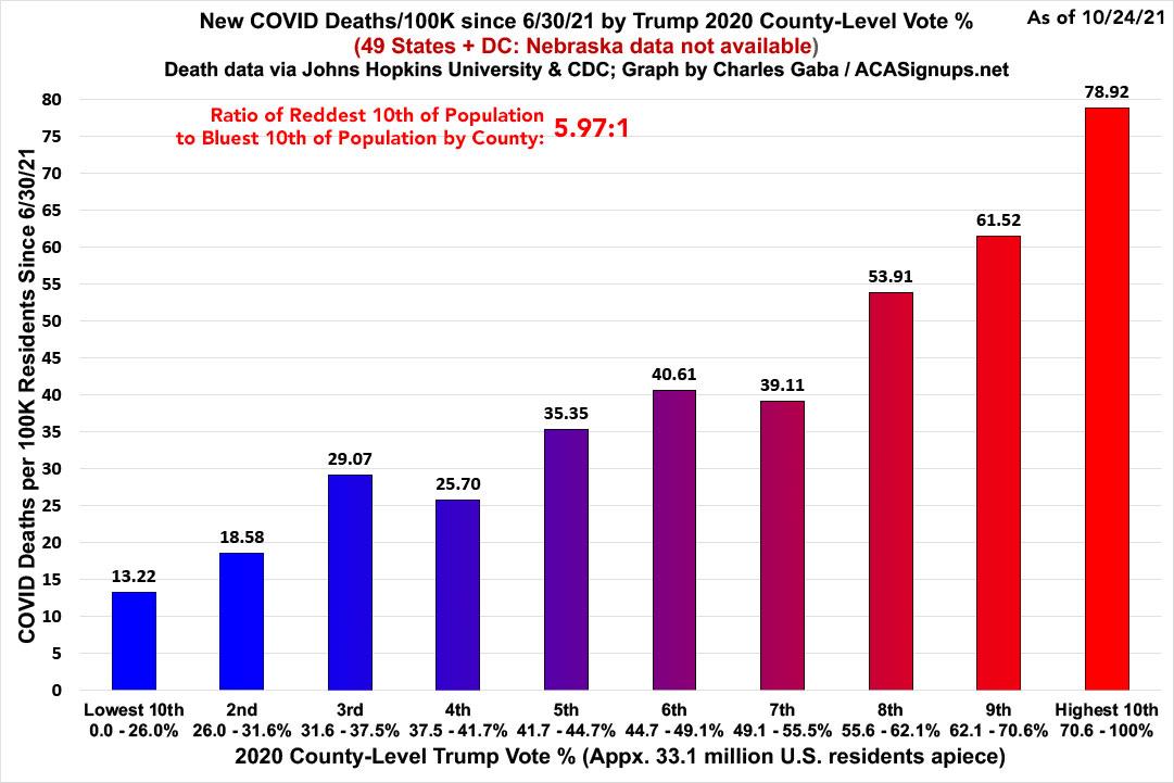 ...while the death rate ratio continues to grow, with the rate in the reddest tenth now 5.93* 5.97x higher than in the bluest tenth: