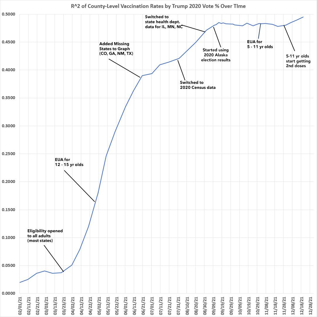 It's also important to note that both the R2 (correlation) and slope formulas, which had plateaued for most of October and November, appear to be increasing again now that 5 - 11 year olds have started receiving their 2nd Pfizer shot: