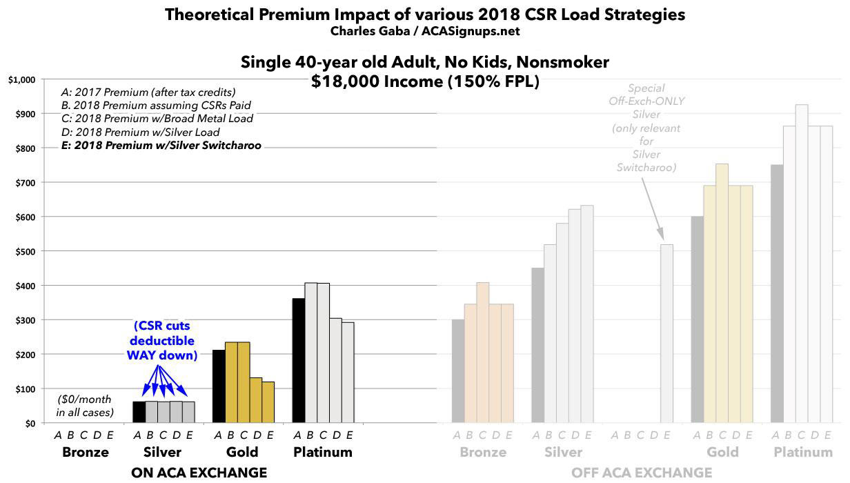 I've written a lot in recent weeks about the real world impact that Trump cutting off CSR reimbursement payments will have on 2018 premiums in various states depending on how they choose to load the additional cost. As I've noted repeatedly, there are basically four strategies they can take: They can assume the payments will continue; they can spread the load across all ACA-compliant policies; they can load all of the cost onto Silver plans only; or they can load all of the cost onto on-exchange Silver plans only, while also creating (if one doesn't exist) a special off-exchange-only Silver plan as a backstop for unsubsidized Silver enrollees (aka the "Silver Switcharoo").
