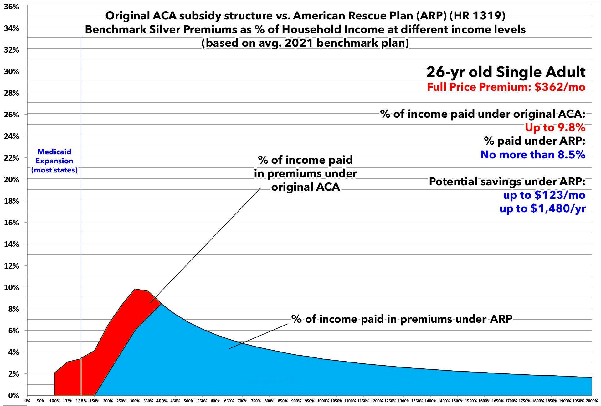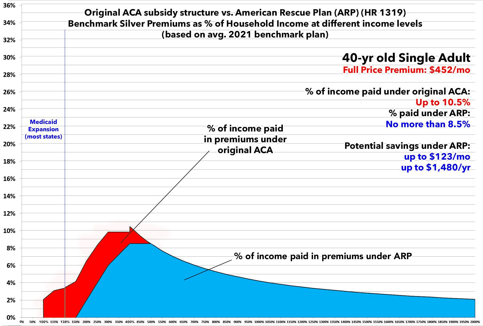 First of all, here's the final, official subsidy table under the ACA today vs. under the American Rescue Plan (ARP). This is the table which will be used at least for 2021 & 2022 (and yes, it's supposed to be retroactive to January 1st, 2021 for current ACA exchange enrollees):