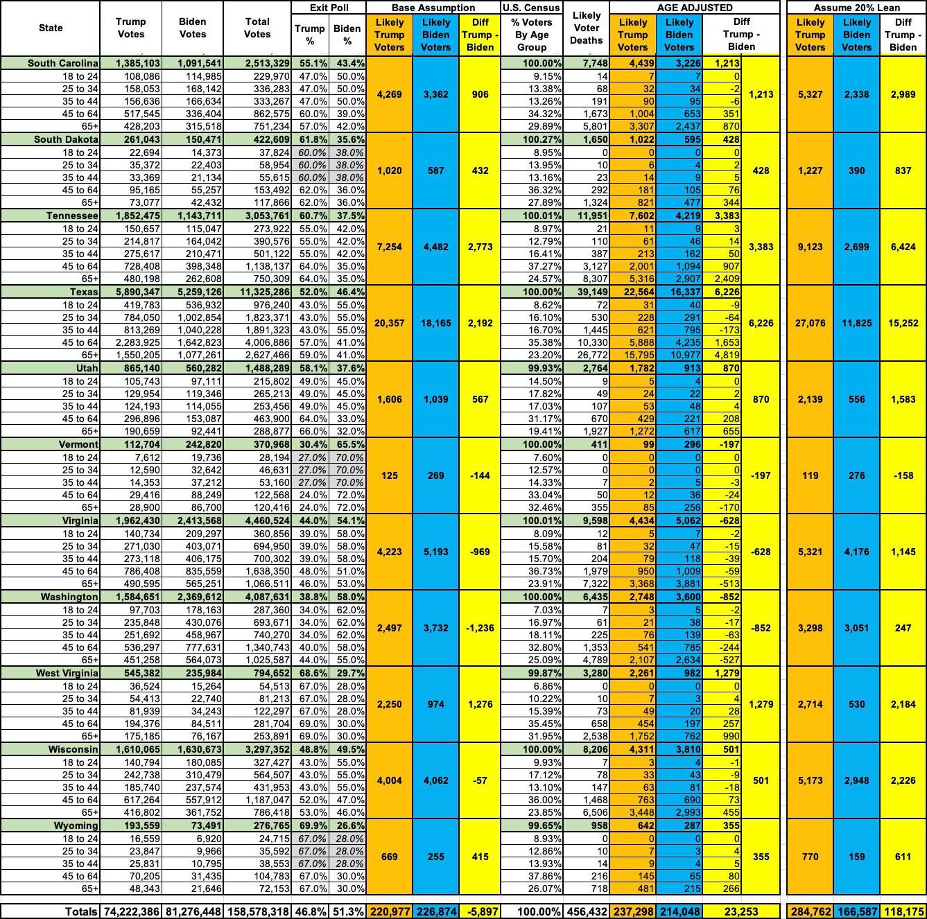 - Finally, the "Assume 20% Lean" columns attempt to account for the other factors I mentioned earlier: Misreported COVID deaths by MAGA coroners, the impact of refusal to wear masks/socially distance and so forth. Assuming this is reasonably accurate, it adds up to around 118,000 more Trump voters (roughly a 135,000 swing from popular vote expection).
