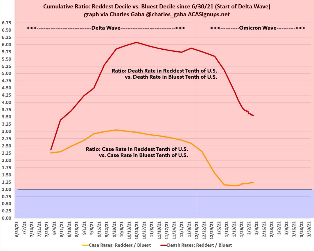 This shift over time is even more obvious (at least on the case rate side) when I go back to June 30th. As I recently noted, by mid-January, Omicron had almost completely cancelled out the "Red/Blue divide" in terms of cumulative case rates since June, which had reached as high as a 3:1 ratio before starting to recede...but the death rate was still 4x higher in the reddest counties in the U.S. than the bluest as recently as a couple weeks ago.
