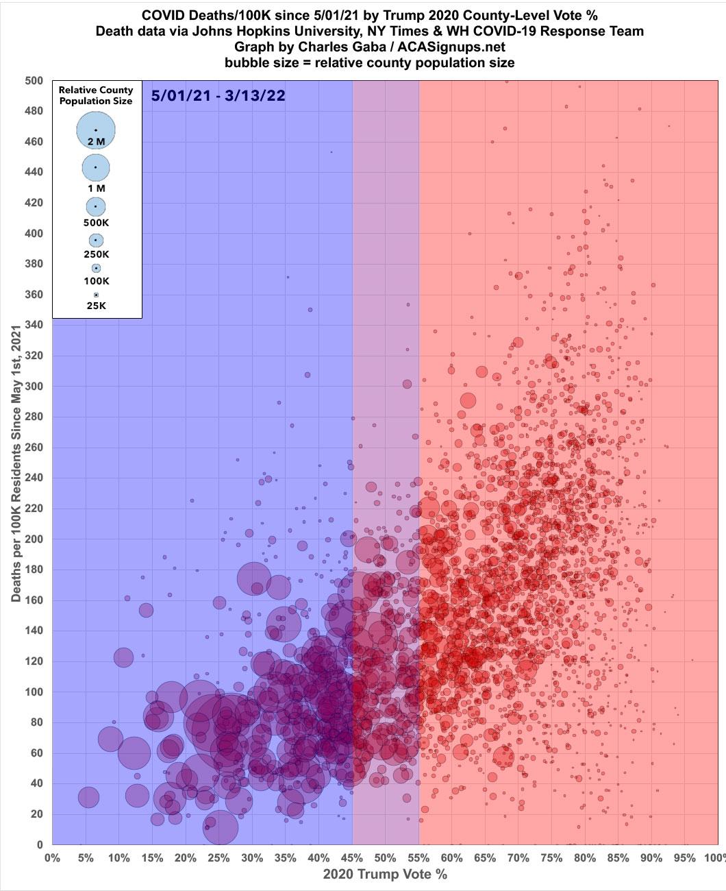 With that in mind, here's both the county-level and state-level COVID death rates since May 1st, 2021 (the point at which all U.S. adults were eligible to get vaccinated), broken out by 2020 partisan lean. First, here's the county-level graph:
