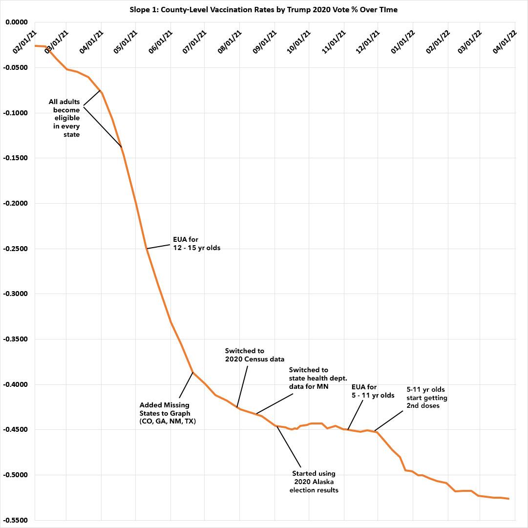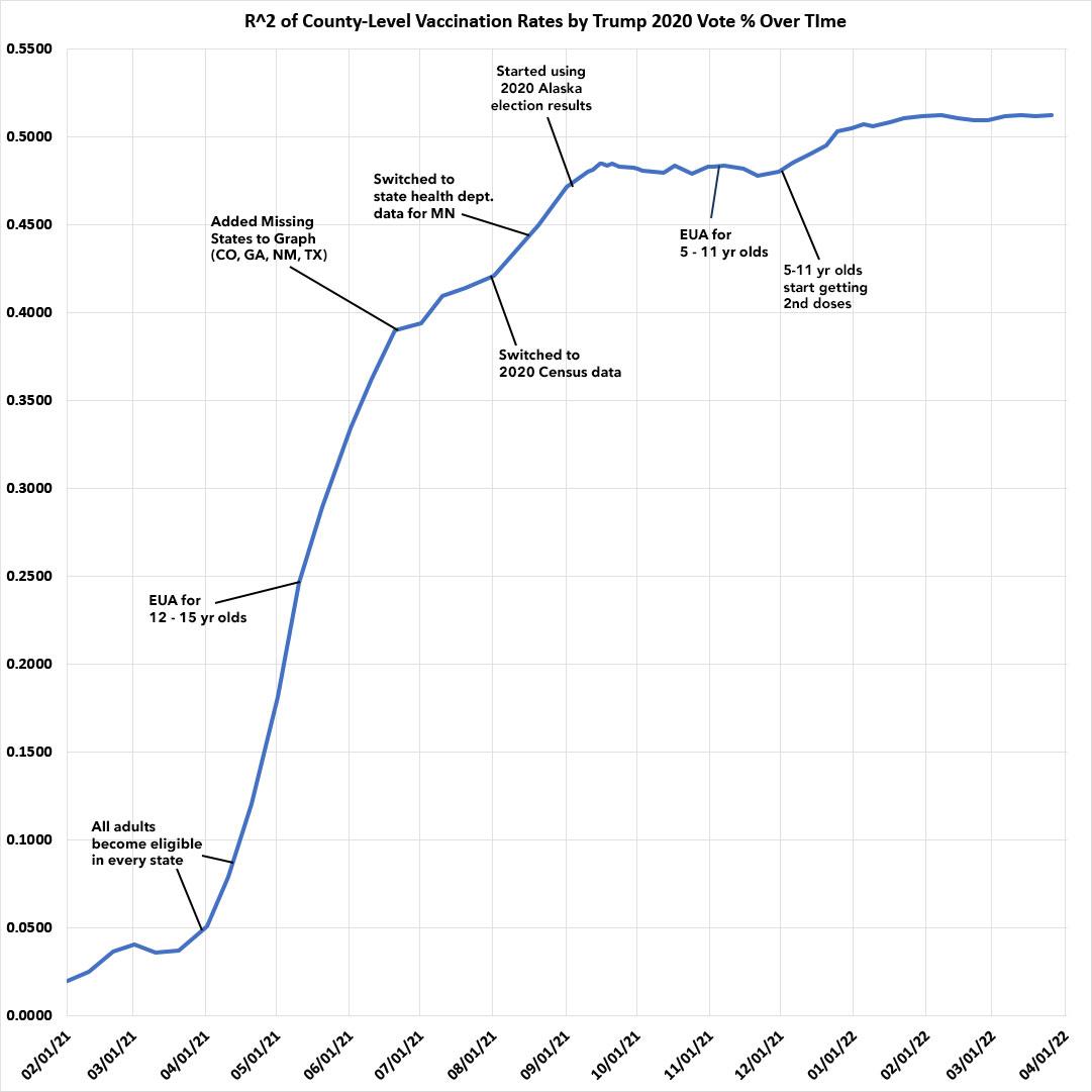 It looks like the mini-spike of the R-squared line increasing in response to 5-11 yr olds receiving their 2nd COVID shots starting around Thanksgiving has leveled off again. I'd imagine there will be one more final mini-spike once children under 5 years old are approved to get vaccinated as well; after that there's really no way for the slope to increase any further as the bluest counties are starting to bump up against their likely vaccination rate ceilings: