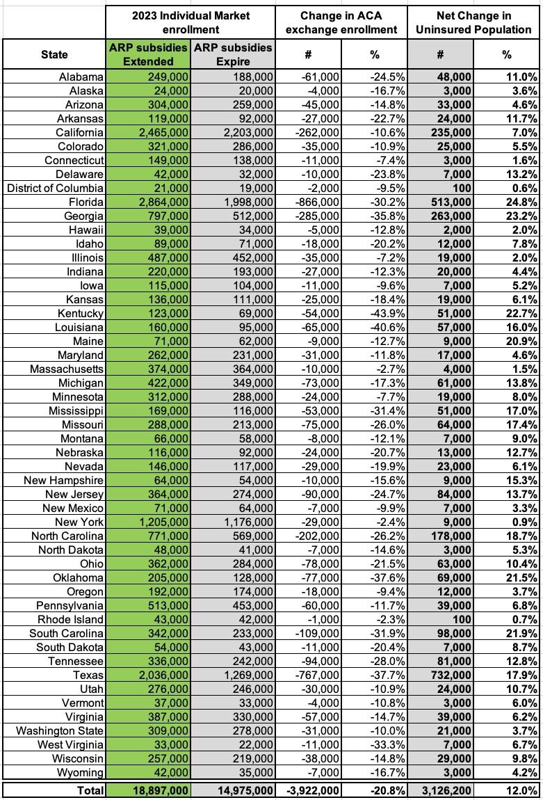 Here's the table breaking out the estimated change in Individual (aka Nongroup) Market enrollment by state in 2023 if the ARP subsidies are extended vs. if they aren't. I've also included the columns showing the Urban Institute's estimate of the net increase in the uninsured population in each state if the ARP subsidies are allowed to expire at the end of this year: