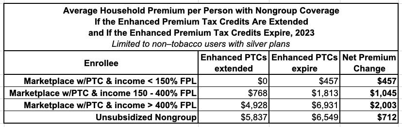 Decreases in Marketplace enrollment without the enhanced PTCs would worsen the risk pool and raise premiums, so even people ineligible for PTCs would pay $712 more in premiums per person. These estimates are based on the characteristics of simulated enrollees with and without extension of the enhanced PTCs. In addition to differences in the applicable percentage-of-income limits for benchmark coverage (table 1), the estimates reflect differences in the incomes, ages, and family sizes of enrollees in each income group.