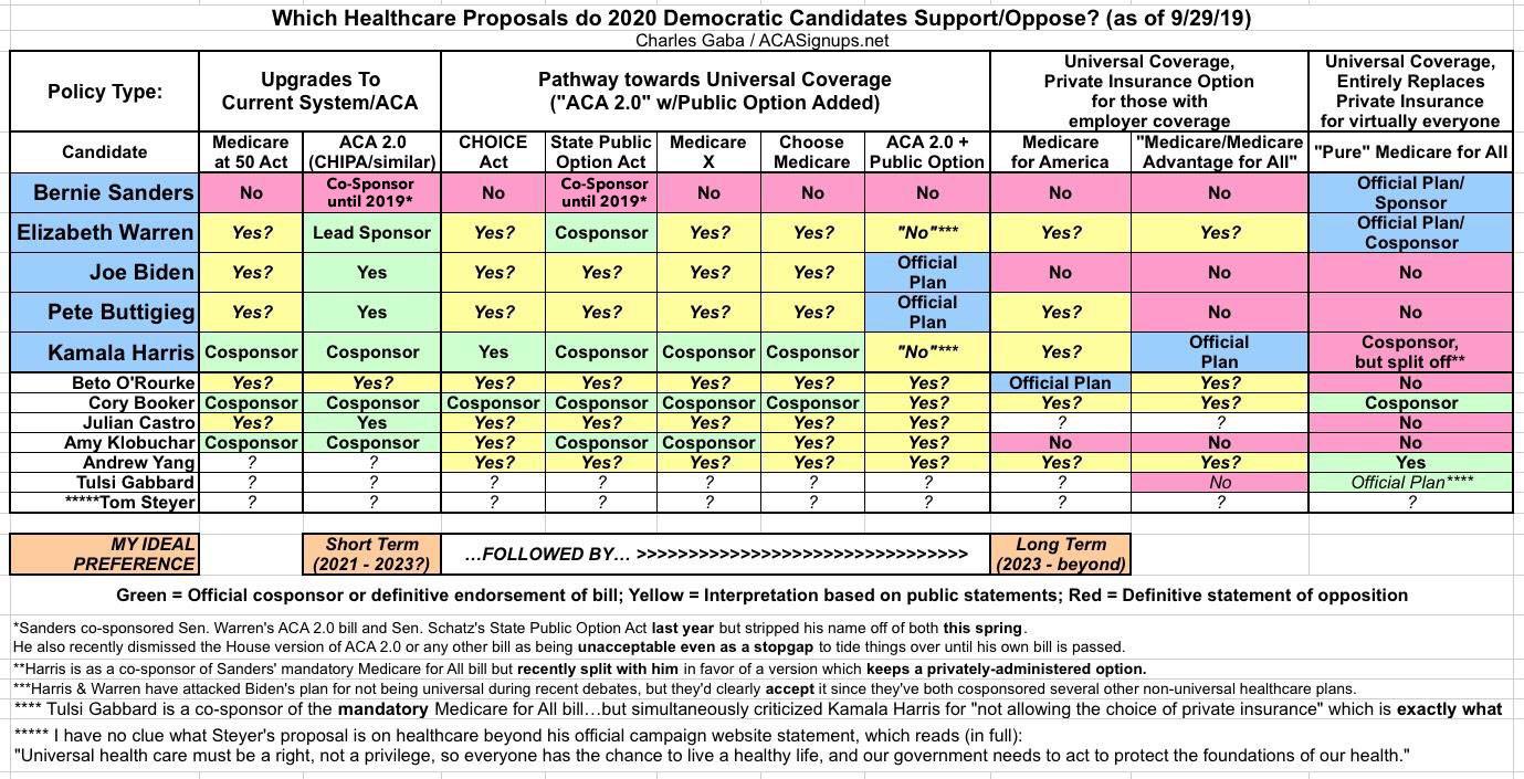 I feel so strongly about this "two stage rocket booster" approach that I even included it in my "Where the Democratic Candidates Stand" summary table from a few months back. As you can see at the bottom, while the candidates keep pushing for one particular bill/plan or another, I've been urging them to pass ACA 2.0 first and then worry about the next phase later on, whether it's "pure" M4All or my preferred long-term plan, Medicare for America (which amounts to "Medicare for All with a PRIVATE Option").