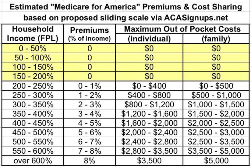 The "gradually decrease to zero" part aside, everything else in this bullet is directly taken from Medicare for America: Zero cost under 200% FPL, zero deductibles for anyone regardless of income, sliding scale premiums over that, and sliding scale maximum out of pocket cost sharing with a cap, although it sounds like it'd be even more generous than Med4America.