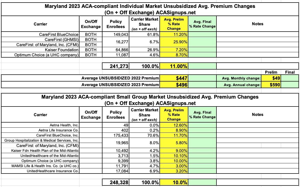 Maryland: (Preliminary) Avg. Unsubsidized 2023 #ACA Rate Change: +11.0%