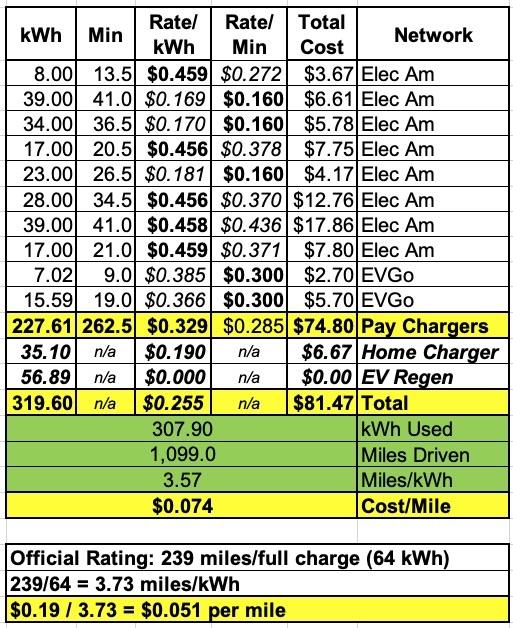 As you can see, I spent a total of $74.80 at the various public charging stations for a total of 227.61 kWh. That breaks out to just under $0.33 per kWh...which happens to be very close to the $0.35/kWh midrange I noted above. The most I paid was $0.46/kWh; the least was $0.17/kWh.