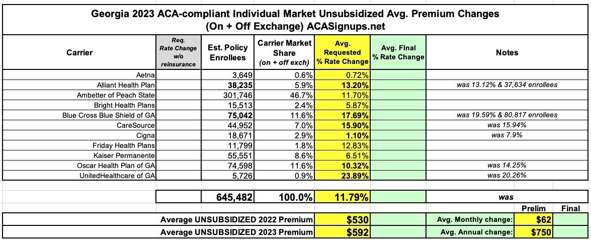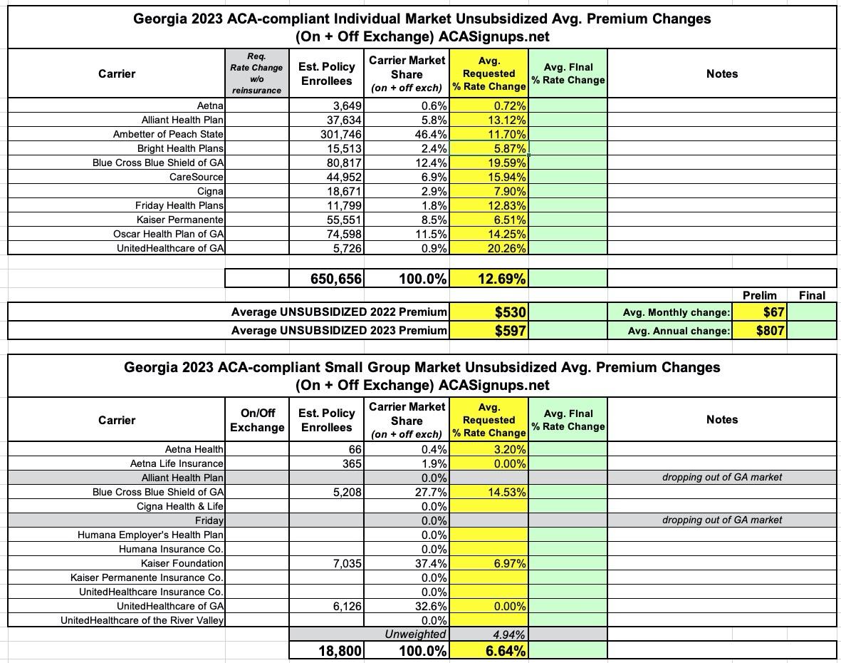 UPDATED: Georgia: (Preliminary) avg. unsubsidized 2023 #ACA rate changes: +11.8%, includes reinsurance program