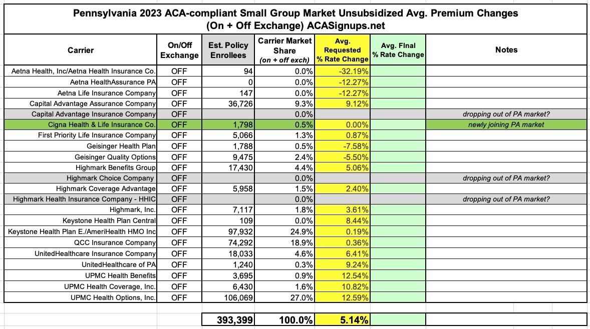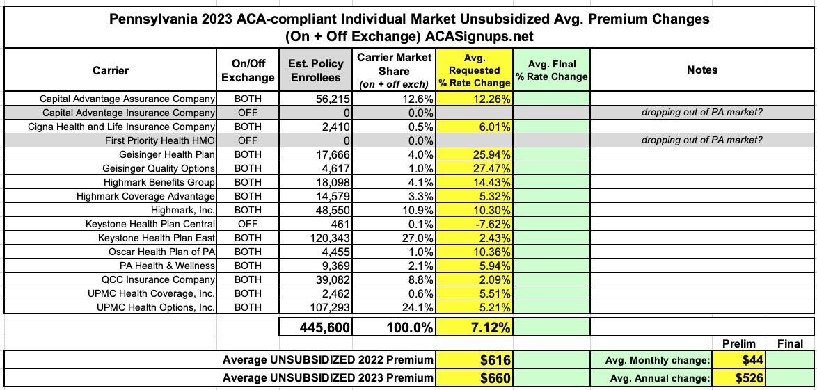 Pennsylvania: (Preliminary) 2023 unsubsidized #ACA rate changes: +7.1%