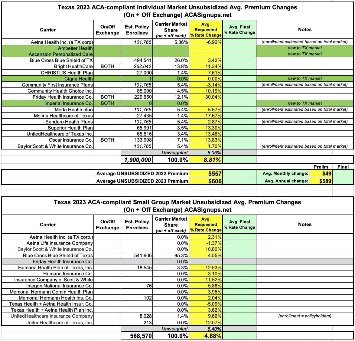 Texas: (Preliminary) Avg. unsubsidized 2023 #ACA rate changes: +8.8%