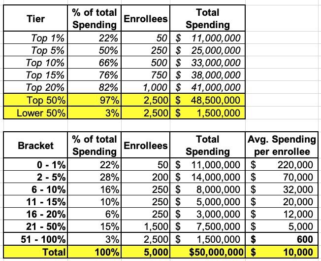 As you can see, in this example, there's around 50 enrollees who are racking up over $220,000 in medical spending per year, while 2,500 are averaging just $600/year apiece.