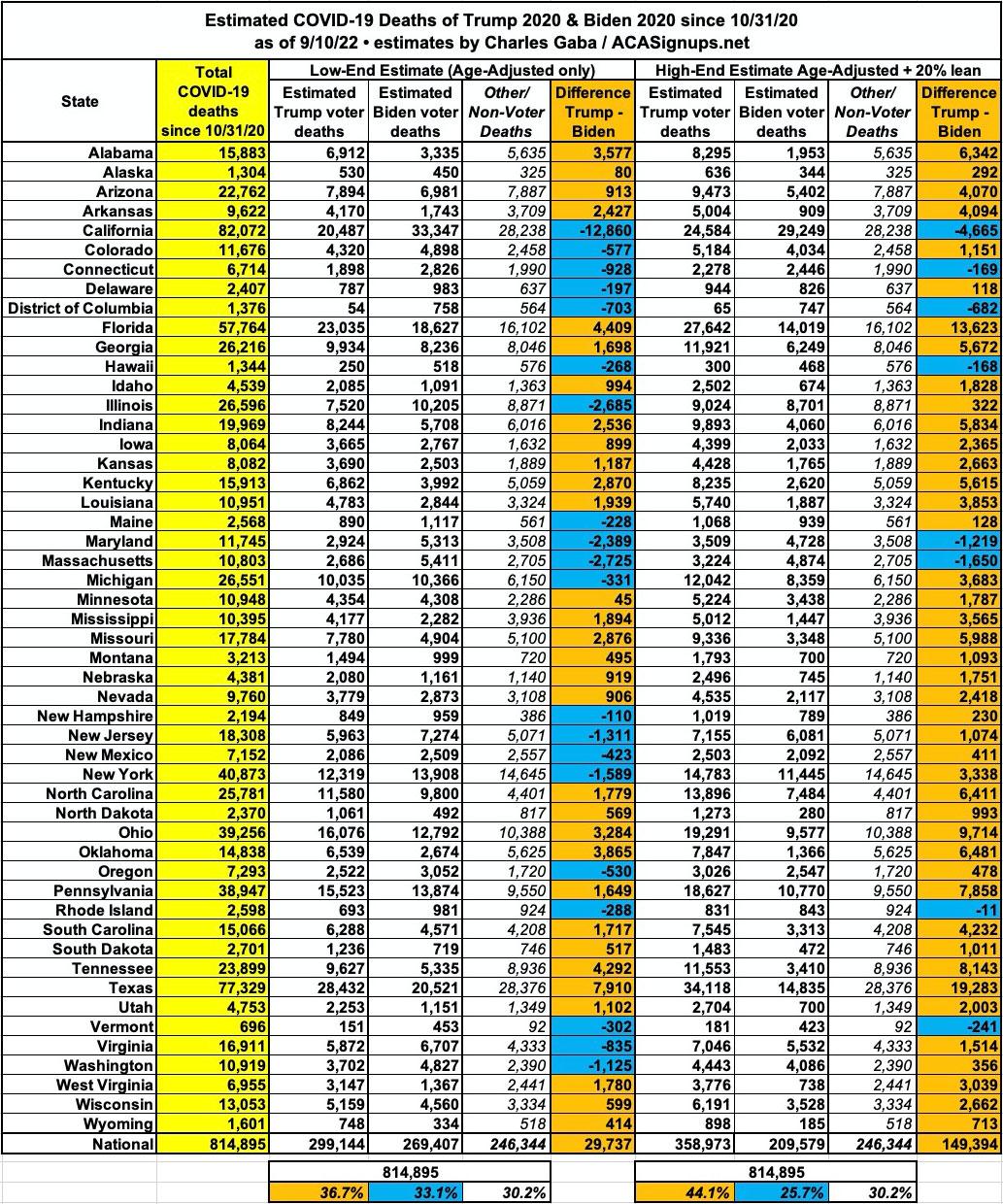 - The "Base Assumption" columns don't take anything into account other than the statewide election results and the post-11/04/20 election COVID death toll in each state. If you stopped there, there'd be 6,300 more Biden voters than Trump voters who've died since the 2020 election...still an 18,700 swing from what a simple national popular vote count would give you.