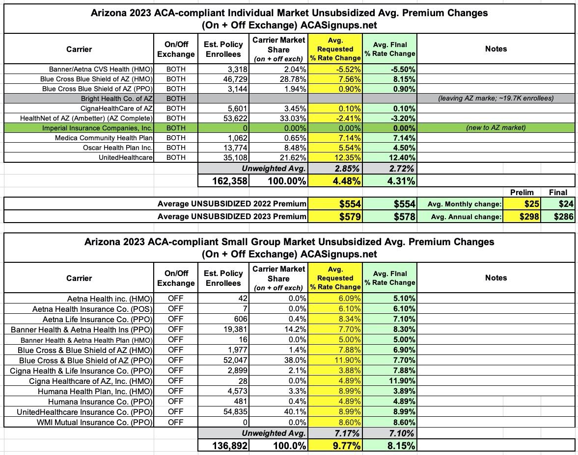 The Arizona Insurance Department has finally posted the final, approved 2023 Individual and Small Group Market premium rate filings.