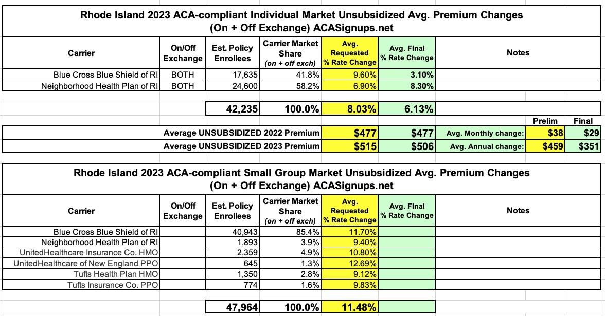 Rhode Island: Final avg. 2023 unsubsidized #ACA rate changes: +6.1% (down from +8.0%)