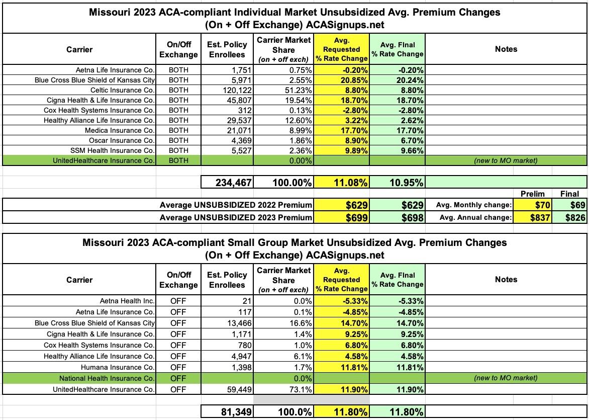 Missouri: Final avg. unsubsidized 2023 #ACA rate changes: +11.0% (updated)