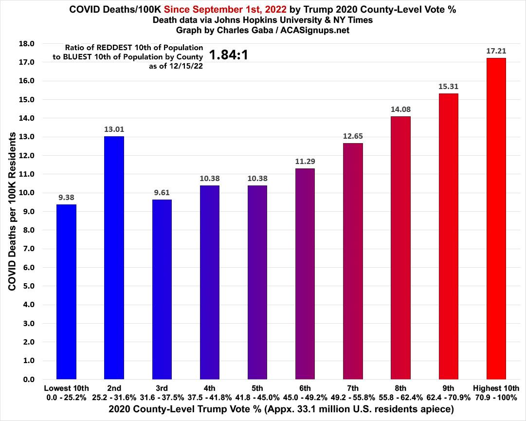 In terms of the partisan divide, this has indeed shrunk dramatically as I expected, with the death rate since September 1st down to just 84% higher in the reddest tenth of the country compared to the bluest tenth. In addition, there's a significant bump in the 2nd-bluest decile (which includes major urban cities like Los Angeles, Queens and Detroit); if you were to compare the reddest fifth of the U.S. vs. the bluest fifth, it would be more like a 1.45:1 ratio: