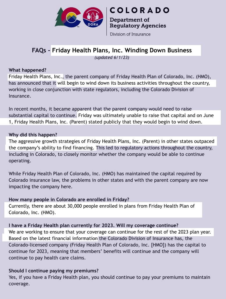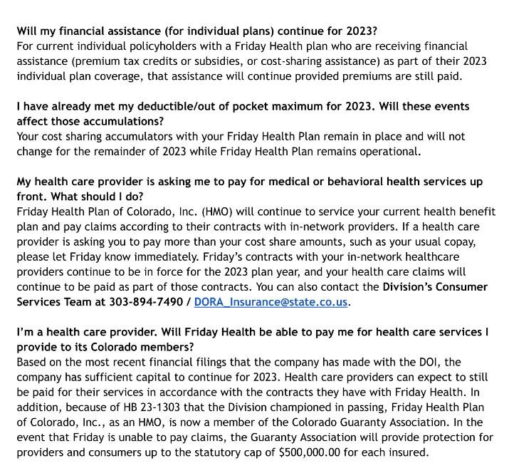 I noted yesterday that Georgia has around ~36,000 residents enrolled in Friday Health Plans who will have to enroll in different coverage before the end of July to avoid a coverage gap. This letter says Friday has around ~30,000 Colorado enrollees who may have coverage through the end of December...but the wording is pretty clear that this isn't guaranteed.
