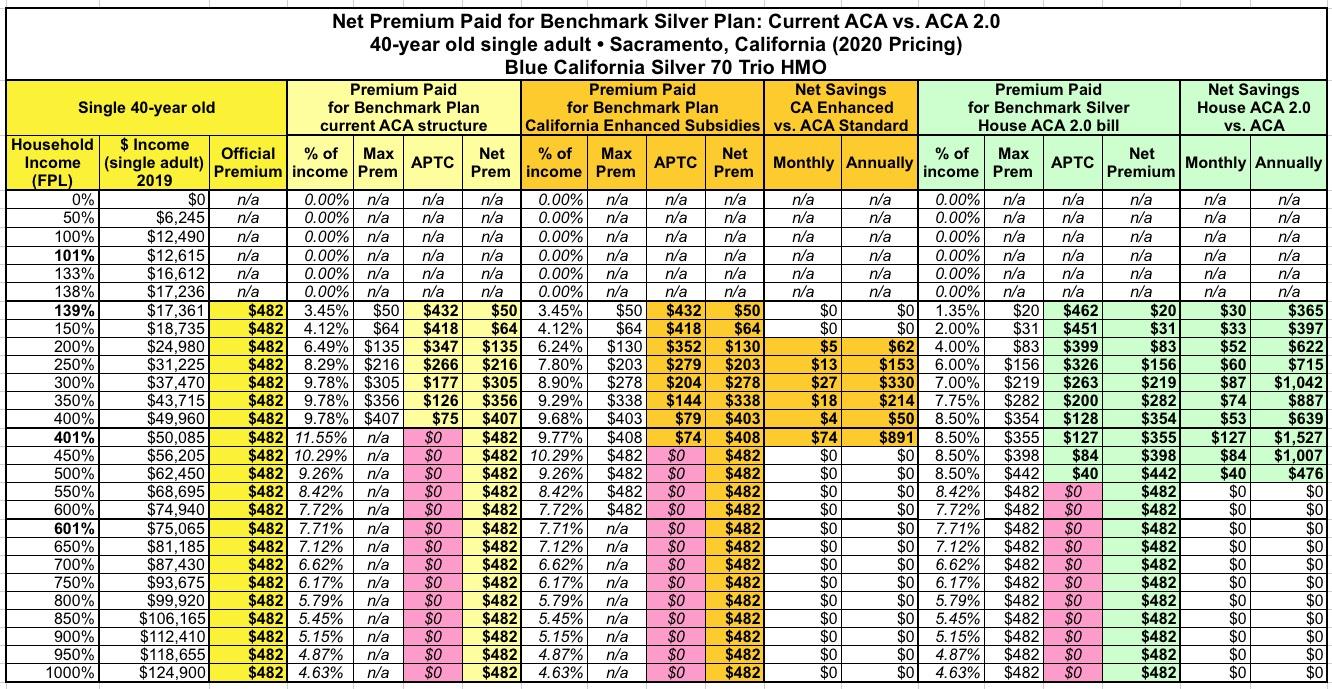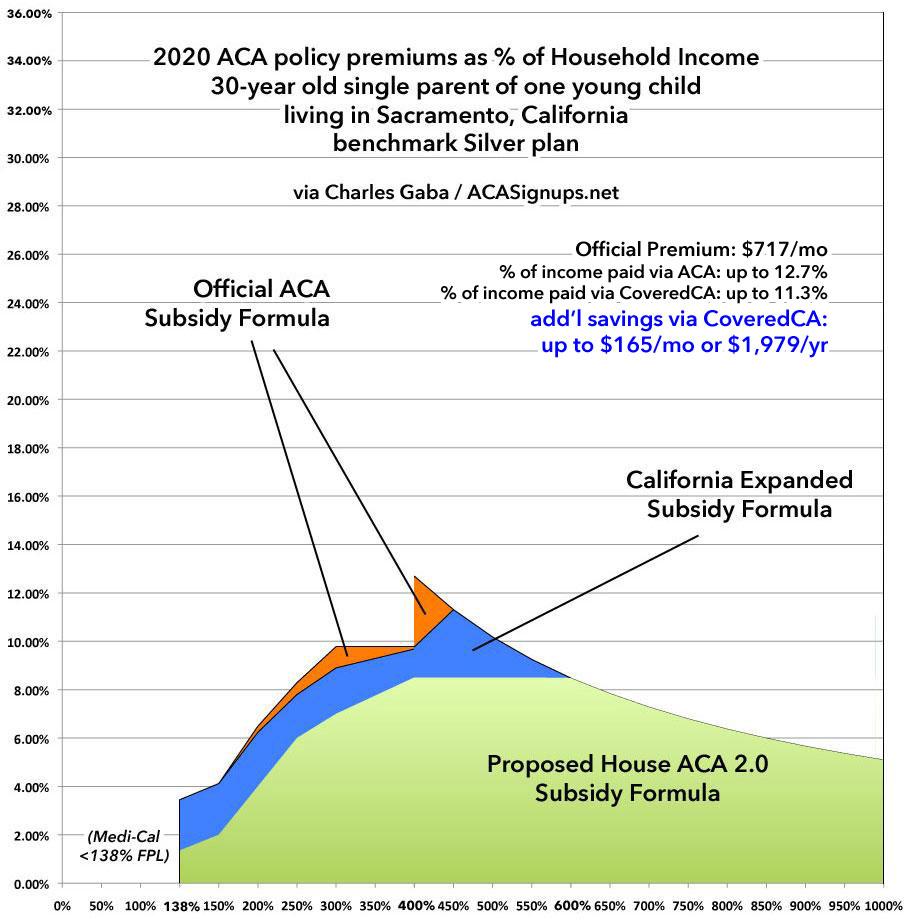 IMPORTANT: As I've noted before, Covered California has arranged to expand and enhance their ACA premium subsidies beyond the official ACA formula starting with the 2020 Open Enrollment Period. Back in October, I posted a detailed analysis, complete with tables and graphs to explain just how much hundreds of thousands of Californians could save under the new, beefed-up subsidy structure.