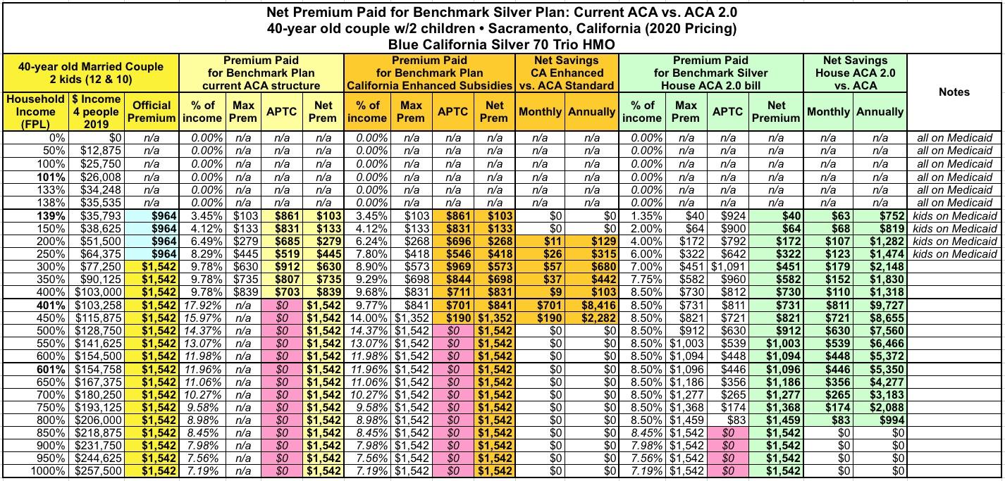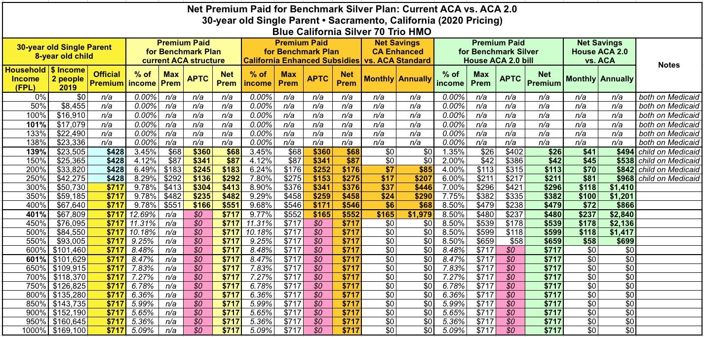 I've also included a third overlay on the tables below: The federal House Democrats ACA 2.0 bill (either H.R. 1868 or H.R. 1884), which would cap premiums at no more than 8.5% of income. The official ACA formula is in Orange; the California subsidy formula is in Blue, and the proposed ACA 2.0 structure is in Green.