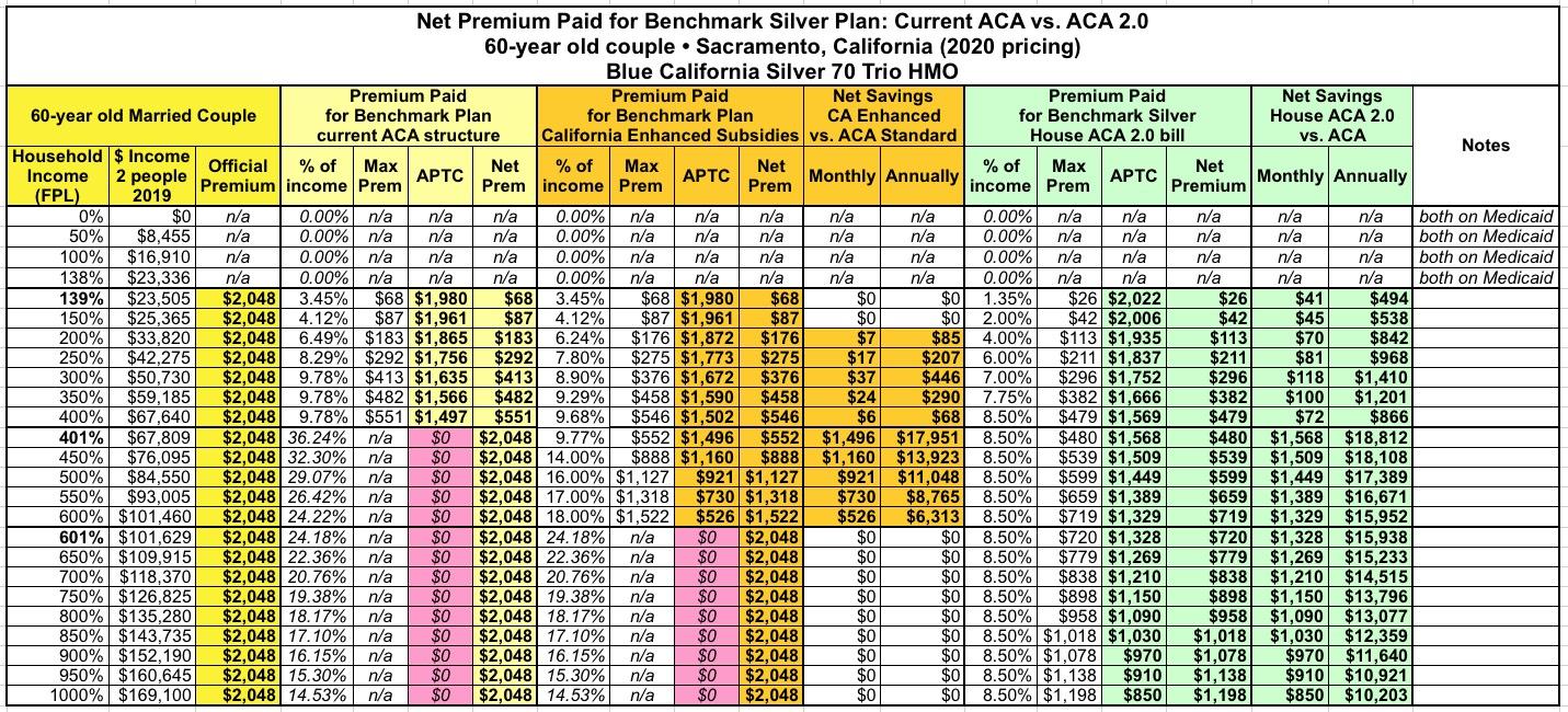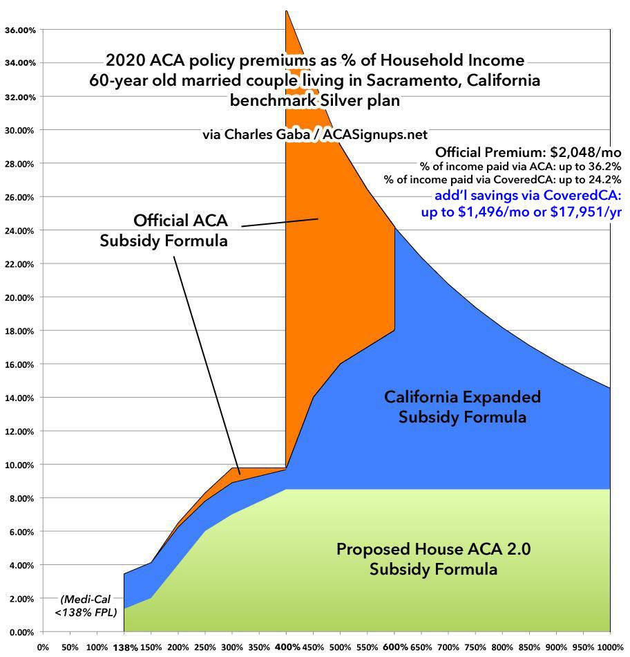 Under the official ACA structure, the total cost for both would be limited to no more than between $103 - $839/month between 138 - 400% FPL...after which it would immediately jump to the full $1,542/mo, or over $18,500/year. Under California's expanded subsidies, however, they'd receive additional savings of as much as $680/year between 250 - 400% FPL...and as much as $8,400 between 400-600%.
