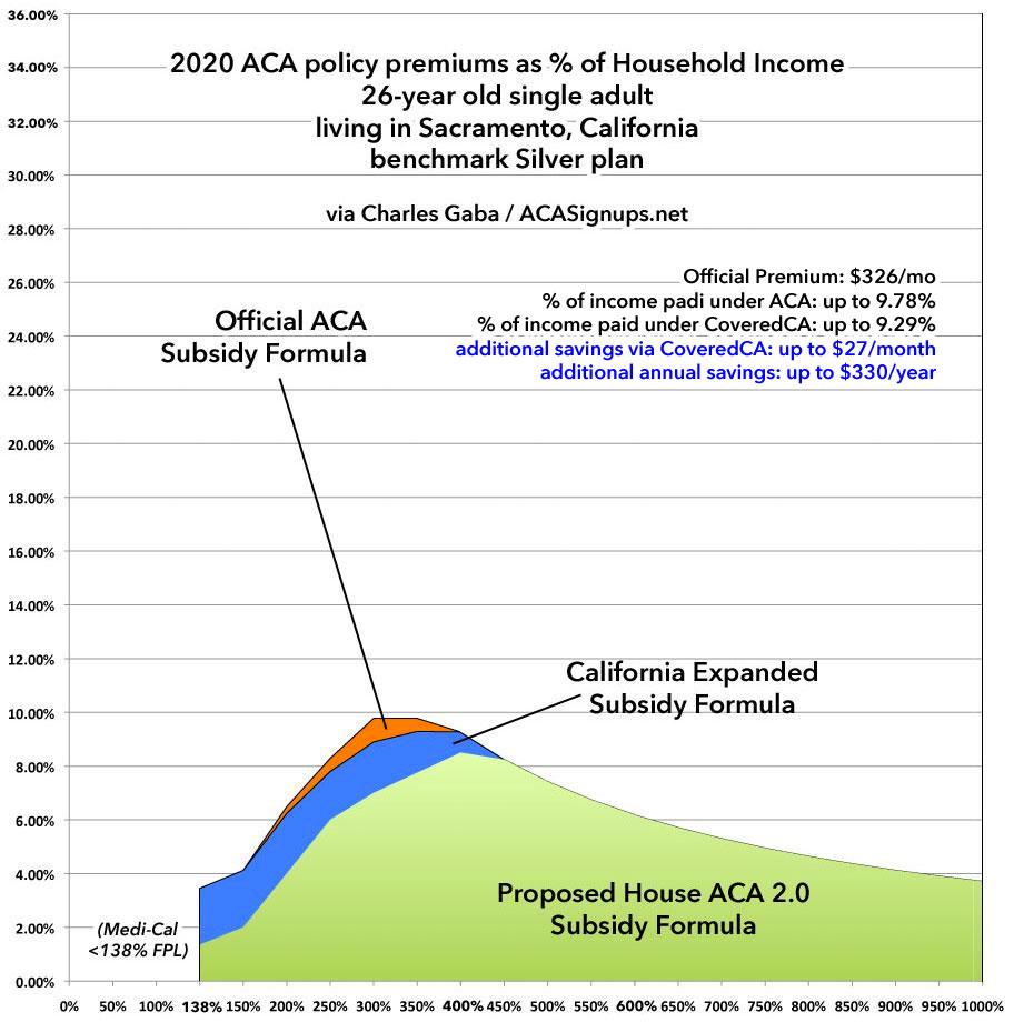 - The final California formula is more generous yet: It's pretty much the same up to 400% FPL, but caps premiums between 9.8 - 18% of income between 400 - 600% FPL.