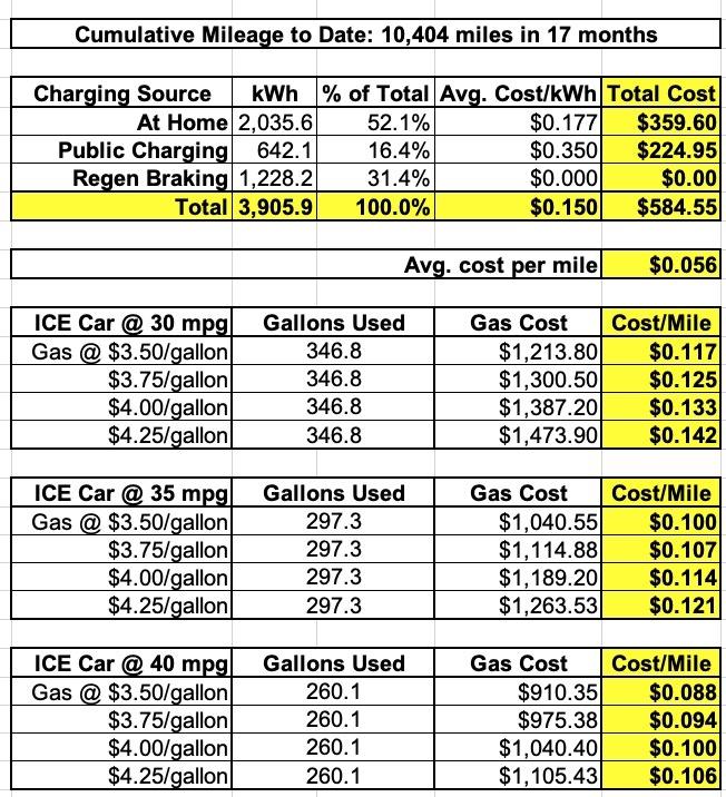 In short, I've spent around $585 on electricity so far, including $360 via residential charging at home and $225 via public fast charging stations. Over 30% of the electricity has been generated via regenerative braking. The overall average cost has worked out to about 5.6¢ per mile.