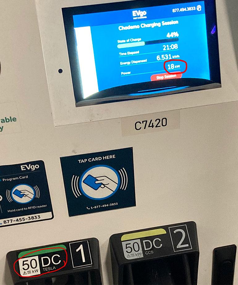 • Once they did get it working, for some reason it only charged their Tesla battery at a slow-poke 18kW rate...and that was when the battery was only at around 40% charged, so it should have been charging at pretty close to the 50 kW maximum rate.