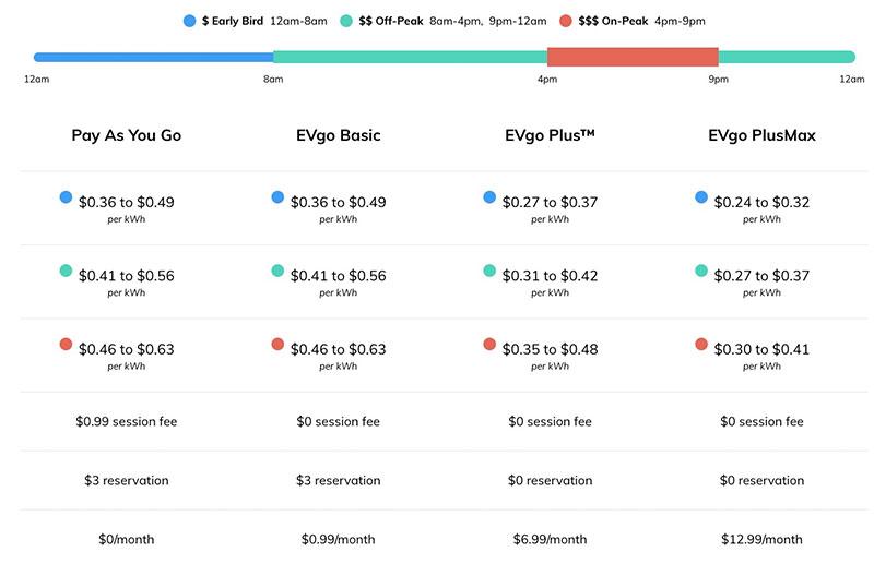 For instance, here's EVgo's pricing for their different plans. Clear as mud, eh? (They even have a "reservation fee" for some plans, which I'm guessing is only necessary in areas like San Francisco where there are tons of EVs on the road). And these rates differ by region as well!