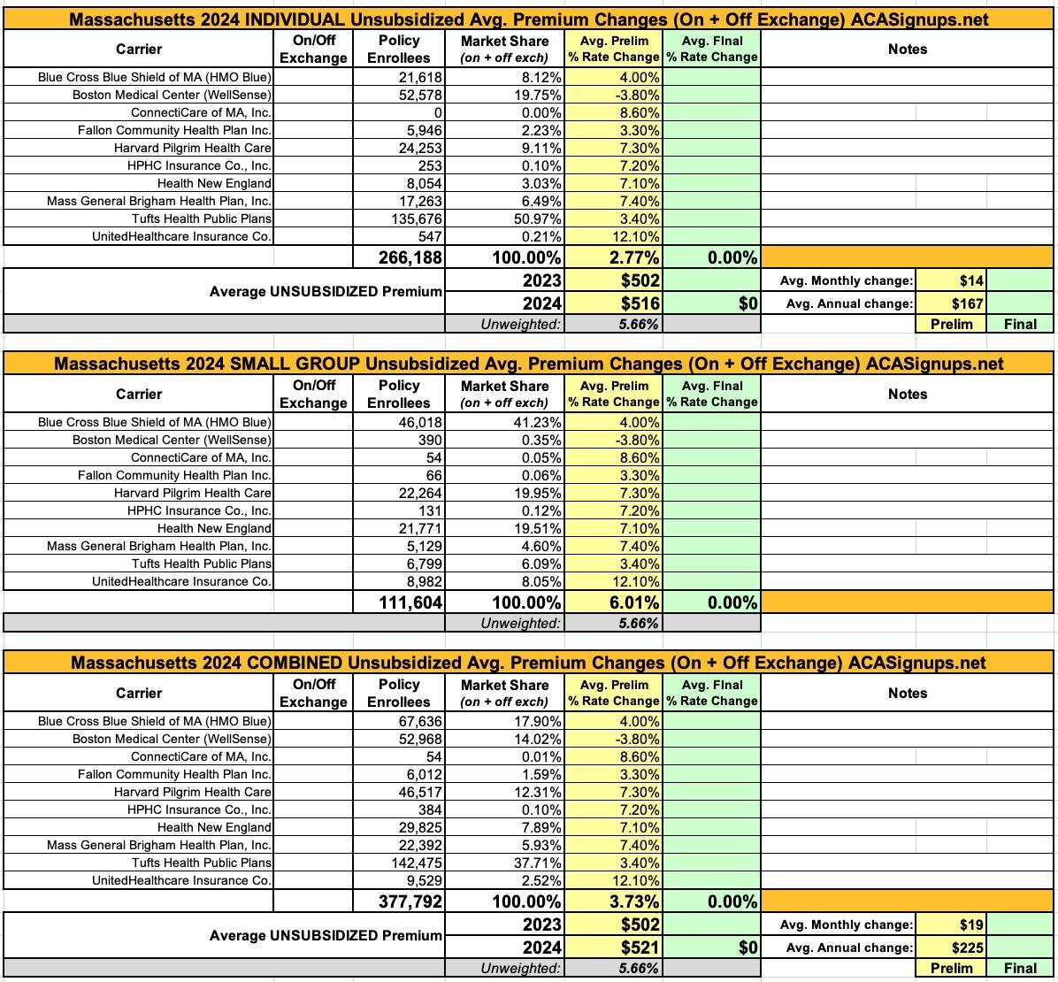 Massachusetts: Preliminary unsubsidized avg. 2024 #ACA rate changes: +3.7% (fully weighted, merged market)