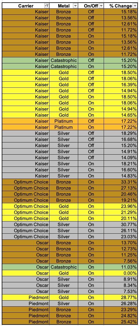 Overall, it looks like Bronze plans are going up perhaps 19.0%, Silver plans by 27.0% and Gold plans by around 24.5%.