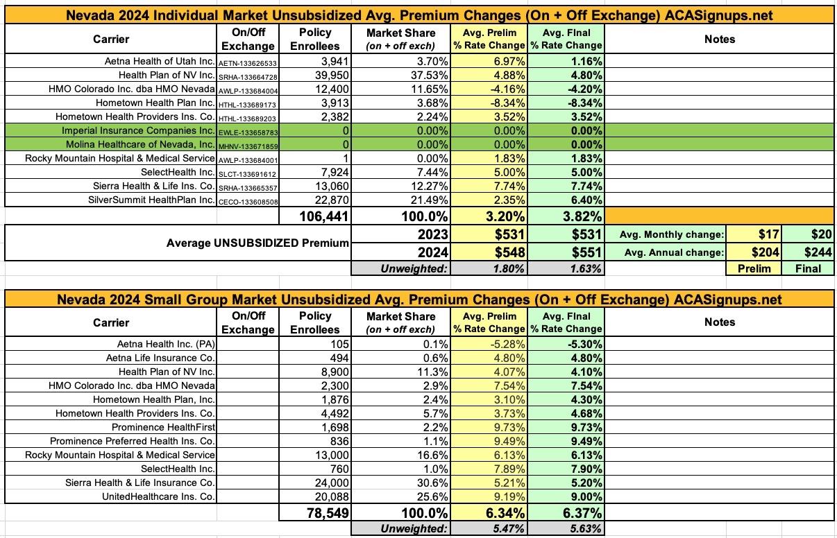 Nevada: *Final* avg. unsubsidized 2024 #ACA rate changes: +3.8%; Molina & Imperial joining market