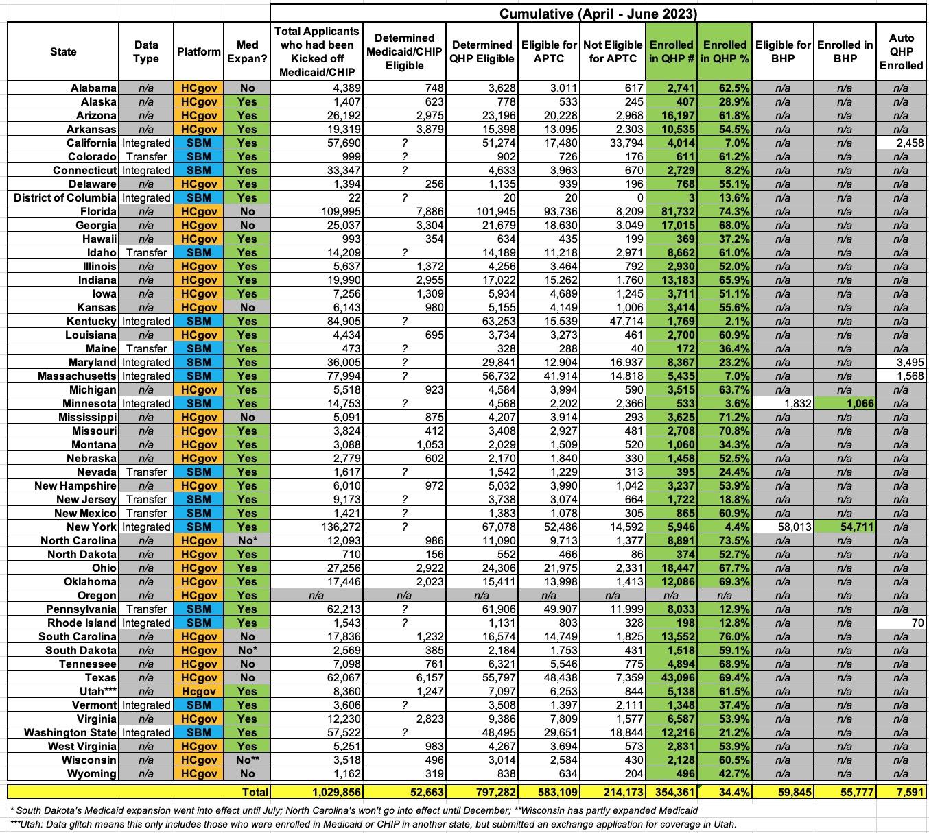 Across all states, that's 354,361 who actually enrolled in a QHP through the end of June, plus the BHP enrollees for a total of 410,138 total.