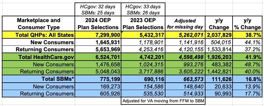 I've also had to adjust for the fact that Virginia moved from the federal exchange to its own state-based exchange this year, which is further complicated by CMS reporting 5 weeks for the federal exchange but only 4 weeks for state-based exchange. Otherwise, the subtotals are accurate, while the new/returning breakout for 2023 are estimates,but should still be pretty close:
