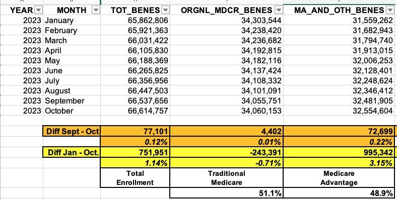The most significant takeaway here is that traditional Medicare enrollment continues to be flat, while Medicare Advantage (MA) enrollment continued to increase..putting Medicare Advantage enrollment at 48.9% of the total.