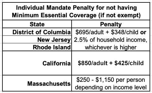 In CA, DC, NJ & RI, the penalty either identical or very close to the old federal penalty. Massachusetts uses their own formula. The financial penalty for not having coverage (assuming you don't qualify for an exemption) will be charged when residents file their 2022 state taxes in spring 2023.
