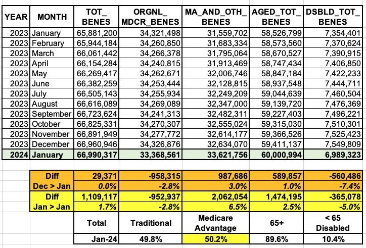 - Enrollees 65+ broke 60 million for what I'm assuming is the first time (60,000,994, up 589,857 from December)