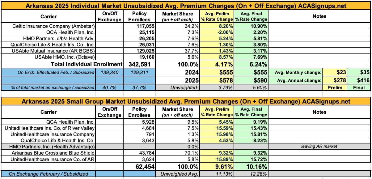 Arkansas: *Final* avg. unsubsidized 2025 #ACA rate changes: +6.2% (updated)