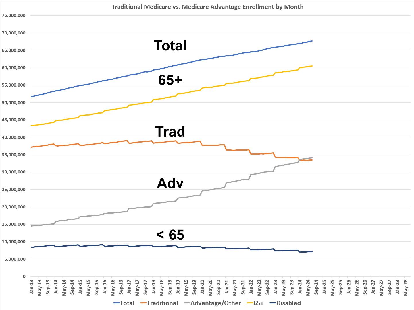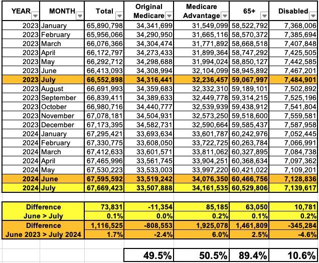 - Total Medicare beneficiaries reached 67,669,423...up 73,831 from June.