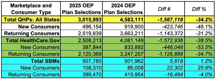 Huh? How could that be? From the initial numbers, it looks like the 2025 OEP is off to an ugly 34% drop in enrollments, even falling below the 2023 initial snapshot total of 3.35 million!