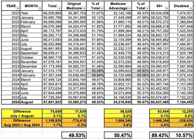 - Total Medicare beneficiaries reached 67,801,923...up 75,659 from July.