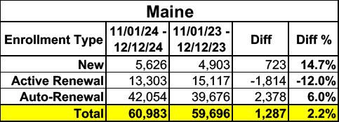 Maine: coverME reports 61K QHP enrollees thru 12/12, enrollment up 2.2% y/y so far