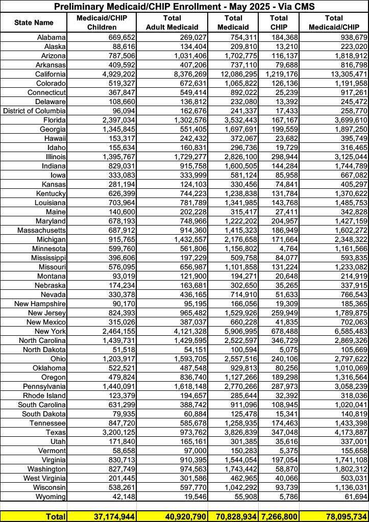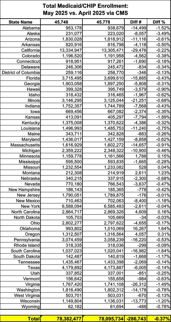 Total Medicaid/CHIP enrollment in May 2025 of ~78.1 million dropped about 0.4% from April 2025, or by just over 287,000 people.