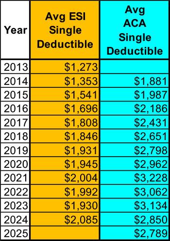 With that in mind, here (again, via KFF) is the average single enrollee deductible for ESI vs. ACA plans over the years: