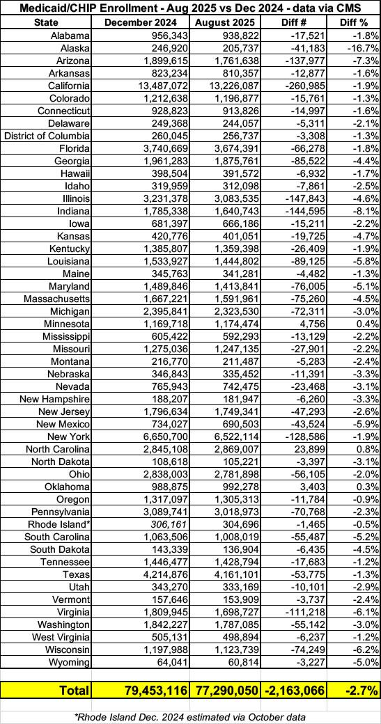 As for my concerns about potential manipulation of data by the Musk/Trump Admin, once again I'm still not seeing any obvious red flags. Between December 2024 and August 2025, net Medicaid/CHIP enrollment has dropped by around 2.16 million, or 2.7%, for whatever that's worth.